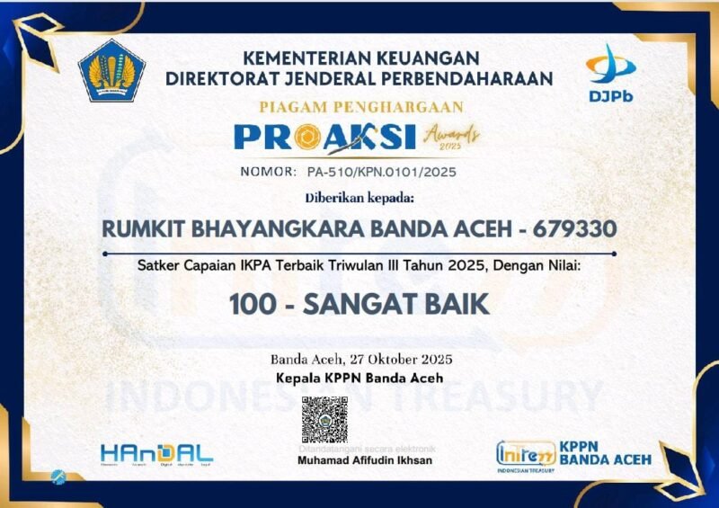 “Rumkit Bhayangkara meraih peringkat pertama Penghargaan Proaksi Triwulan III Tahun 2025 dari KPPN Banda Aceh untuk kategori BLU dengan Laporan Pertanggungjawaban (LPJ) Tercepat dan Tepat Se-Provinsi Aceh Tahun Anggaran 2025. Ini menunjukkan bahwa kami berkomitmen terhadap kecepatan, ketepatan, dan integritas dalam setiap proses pelaporan,” ujar dr. Jamal, Kamis, 30 Oktober 2025.