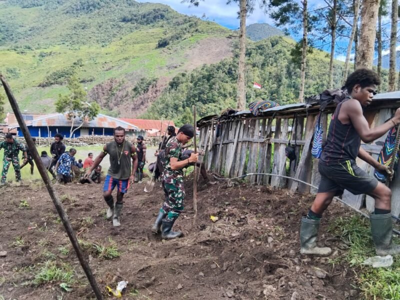 Papua Tengah – Pos Tinggi Nambut Satgas Yonif 112/DJ bersama rakyat melaksanakan kegiatan Karya Bakti Teritorial dengan bergotong royong bersihkan lingkungan di Distrik Tinggi Nambut Kabupaten Puncak Jaya Provinsi Papua Tengah, Senin (10/11/2025).