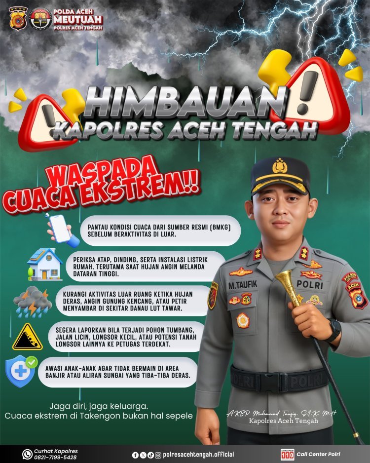 Dalam imbauannya, Kapolres Aceh Tengah AKBP Muhammad Taufiq, S.I.K., M.H, meminta masyarakat untuk selalu memantau informasi cuaca dari sumber resmi Badan Meteorologi, Klimatologi, dan Geofisika (BMKG) sebelum bepergian atau beraktivitas di luar rumah.