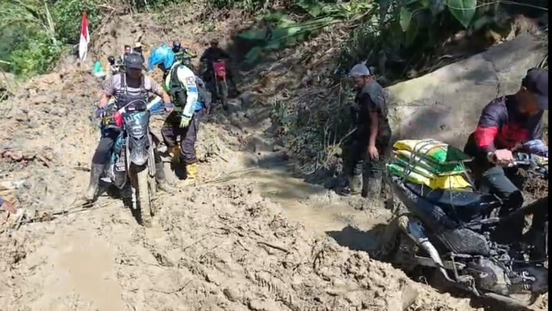 Dengan menggunakan kendaraan trail, personel Polres Pidie berjibaku menembus medan berat demi memastikan bantuan sembako dapat sampai ke tangan masyarakat yang membutuhkan.