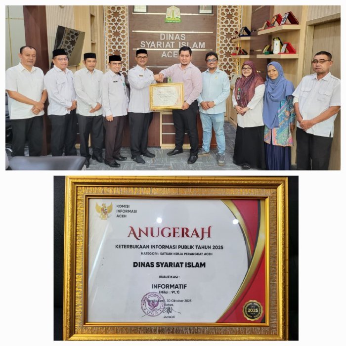 Penghargaan diserahkan secara langsung oleh Bapak Sabri selaku Wakil Ketua Komisi Informasi Aceh kepada Kepala Dinas Syariat Islam Aceh Bapak Zahrol Fajri, S.Ag,MH didampingi Sekdis, Para Kabid dan TIM PPID Dinas Syariat Islam Aceh pada hari Rabu (21/01/2026) di Kantor DSI Aceh.