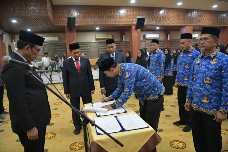 Banda Aceh – Asisten Administrasi Umum Sekda Aceh, Muhammad Diwarsyah, mengukuhkan 610 pejabat administrator dan pengawas dalam lingkungan Pemerintah Aceh, di Gedung Serbaguna Kantor Gubernur Aceh, Jumat, (3/10/2025).