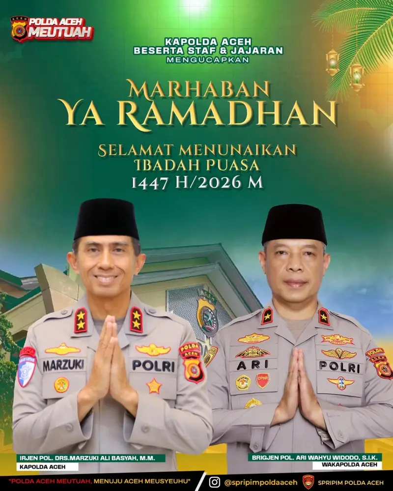 Banda Aceh – Menyambut datangnya bulan suci Ramadhan 1447 Hijriah/2026 Masehi, Kapolda Aceh Irjen Pol. Drs. Marzuki Ali Basyah, M.M., bersama Wakapolda Aceh Brigjen Pol. Ari Wahyu Widodo, S.I.K., serta seluruh staf dan jajaran Polda Aceh menyampaikan ucapan “Marhaban Ya Ramadhan” kepada seluruh masyarakat Aceh.