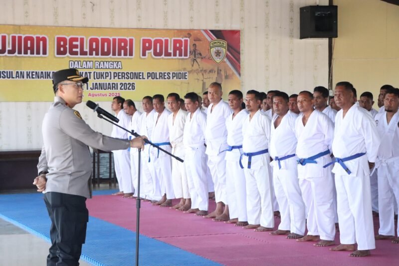 Pidie – Kapolres Pidie AKBP Jaka Mulyana, SIK, MIK memberikan arahan kepada personel Polres Pidie yang mengikuti ujian Beladiri Polri sebagai salah satu syarat usul kenaikan pangkat periode 1 Januari 2026. Kegiatan tersebut berlangsung di Aula Dhira Brata Polres Pidie, Selasa (12/8/2025).