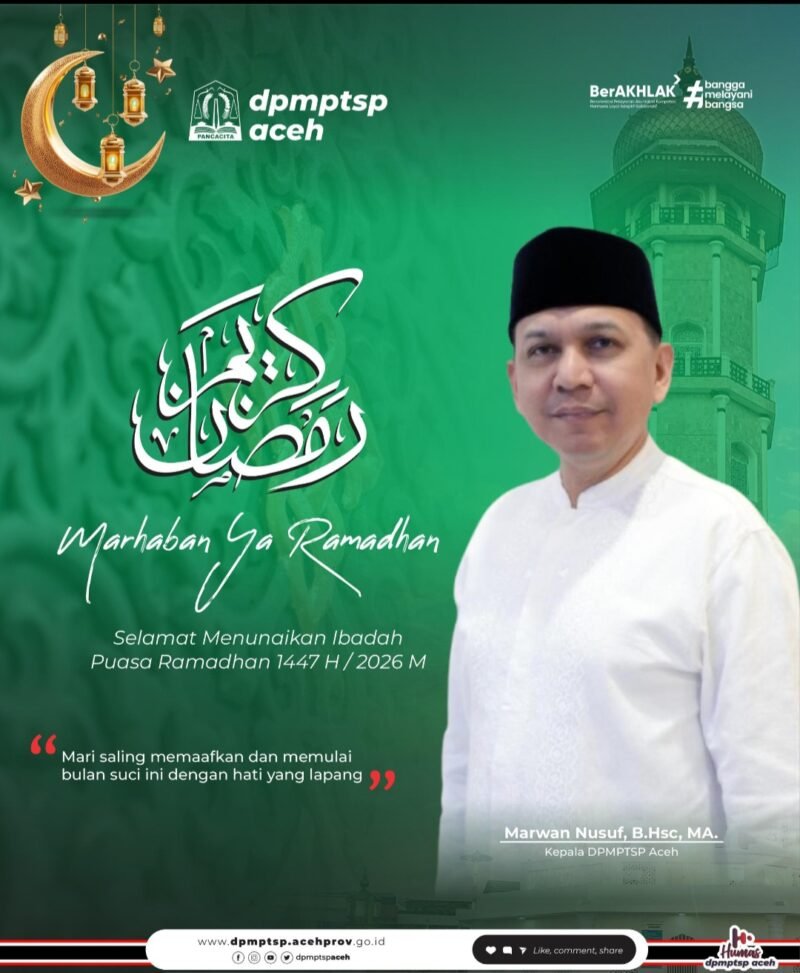 Banda Aceh – Kepala Dinas Penanaman Modal dan Pelayanan Terpadu Satu Pintu (DPMPTSP) Aceh, Marwan Nusuf, B.HSc., M.A, menyampaikan ucapan selamat menyambut Bulan Suci Ramadhan 1447 Hijriah / 2026 Masehi kepada seluruh masyarakat Aceh, khususnya jajaran pegawai DPMPTSP Aceh.
