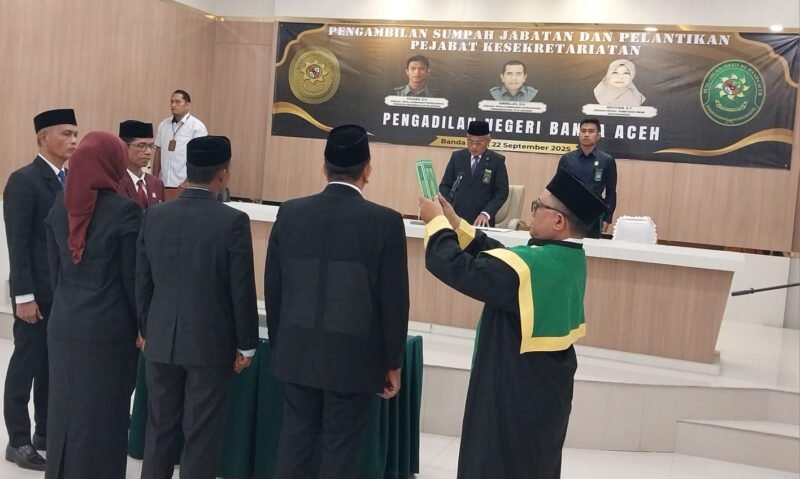 Banda Aceh – Ketua Pengadilan Negeri Banda Aceh, Dr Teuku Syarafi, SH, MH, Senin 22 September 2025 melantik 3 (tiga) orang Pejabat Kesekretariatan Pengadilan Negeri Banda Aceh di Aula PN Bna.