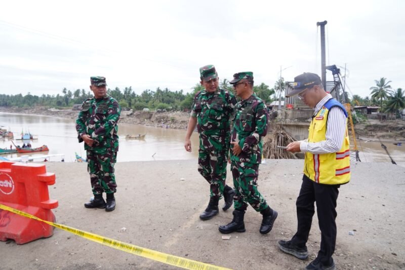 Bireuen — Panglima Komando Daerah Militer Iskandar Muda (Pangdam IM) Mayor Jenderal TNI Joko Hadi Susilo, S.I.P., meninjau secara langsung proses pembangunan Jembatan Kuta Blang yang sebelumnya terputus akibat bencana alam banjir yang melanda wilayah Aceh. Peninjauan dilakukan di lokasi jembatan yang berada di atas Sungai Krueng Tingkeum, Kecamatan Kuta Blang, Kabupaten Bireuen, Sabtu (20/12/2025), sebagai bentuk perhatian dan pengawasan pimpinan terhadap percepatan pemulihan infrastruktur vital pasca bencana.