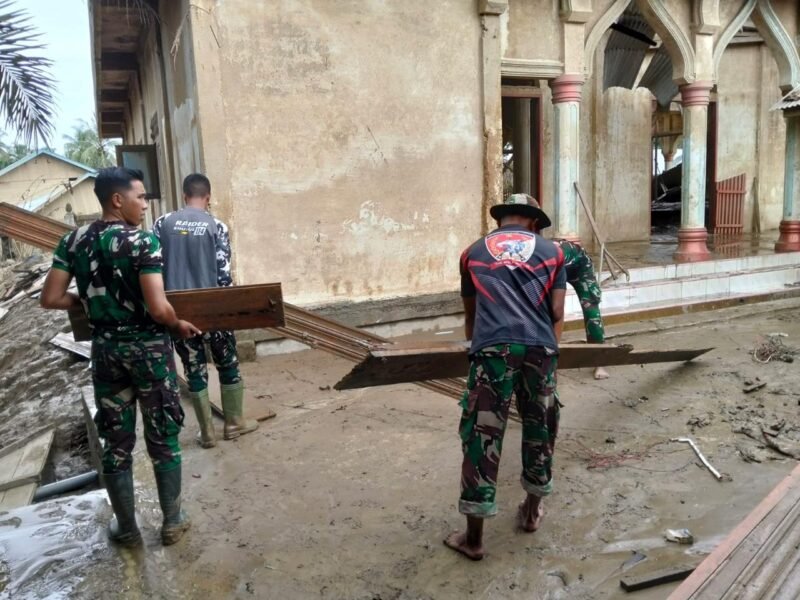 Aceh Utara – Prajurit TNI dari Kodim 0103/Aceh Utara bersama personel Brigif TP 90/Yudha Giri Dhanu, Kodam Iskandar Muda, terus menunjukkan kepedulian dan komitmen dalam membantu masyarakat pasca bencana banjir yang melanda wilayah Kabupaten Aceh Utara. Salah satu bentuk kepedulian tersebut diwujudkan melalui kegiatan karya bakti pembersihan Masjid Kampung Tanah Merah, Kecamatan Langkahan, yang memasuki hari kelima pelaksanaan, Sabtu (13/12/2025).
