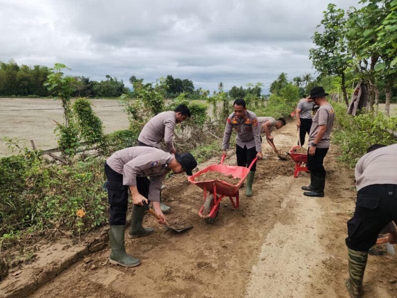 Pidie – Personel Polres Pidie melaksanakan kegiatan gotong royong dan pembersihan daerah terdampak banjir di Jalan penghubung Gampong Puuk menuju Gampong Tanjung, Kecamatan Kembang Tanjung, Kabupaten Pidie, Senin (15/12/2025).