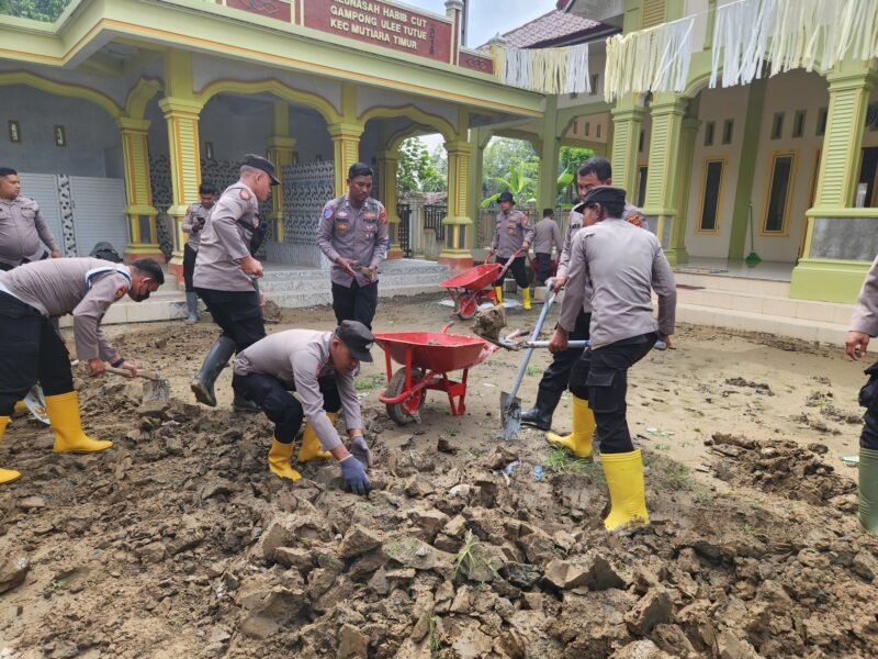 Pidie – Sebagai wujud kepedulian terhadap lingkungan dan sarana ibadah masyarakat pasca bencana banjir, personel Kepolisian Resor (Polres) Pidie melaksanakan kegiatan pembersihan halaman Meunasah Dusun Habib Cut, Gampong Ulee Tutue, Kecamatan Mutiara Timur, Kabupaten Pidie, Selasa, (13/01/2026).