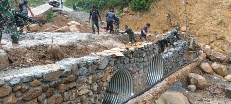 Bener Meriah – Dalam rangka mempercepat penyelesaian pembangunan akses penghubung antar desa, personel Satuan Tugas Penanggulangan Bencana Alam (Satgas Gulbencal) dari Yonzipur 5/Arati Bhaya Wighina bersama personel Koramil 01/Bandar jajaran Kodim 0119/Bener Meriah melaksanakan pemasangan turap di sisi kanan dan kiri Jembatan Aramco, tepatnya di Desa Jamur Atu, Kecamatan Mesidah, Kabupaten Bener Meriah, Senin (23/02/2026).