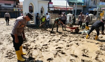 Pidie – Personel Polres Pidie bersama unsur TNI dan masyarakat melaksanakan gotong royong membersihkan lumpur di…