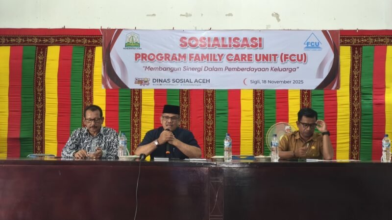 Pidie – Dinas Sosial Provinsi Aceh bekerja sama dengan Dinas Sosial Kabupaten Pidie menyelenggarakan kegiatan sosialisasi Program Family Care Unit (FCU) bagi keluarga pioner.
