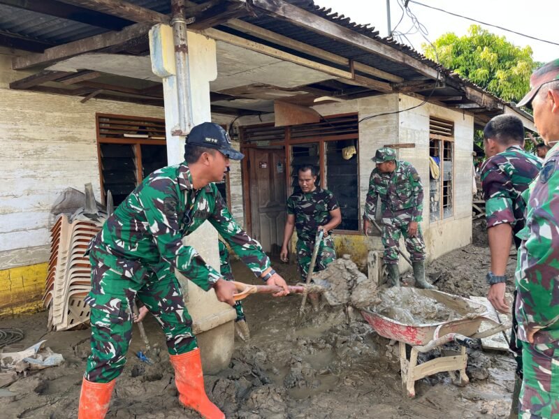 Para personel Yonif TP 857/GG bersama Babinsa setempat secara gotong royong membersihkan sisa-sisa material banjir yang mengendap di dalam maupun di sekitar rumah warga. Lumpur, sampah, serta berbagai material lainnya dibersihkan agar rumah warga kembali bersih, sehat, dan layak untuk ditempati. Selain membersihkan rumah, personel juga membantu menata kembali perabotan warga yang terdampak banjir.